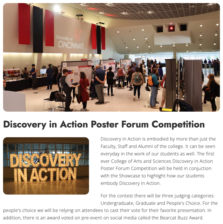 The “Discovery in Action Showcase” is a dynamic event designed to bring the UC College of Arts and Sciences community together. It provides a platform for each academic unit and center to demonstrate how they embody the spirit of “Discovery in Action.”